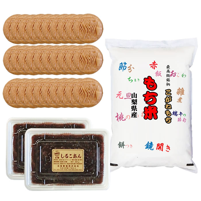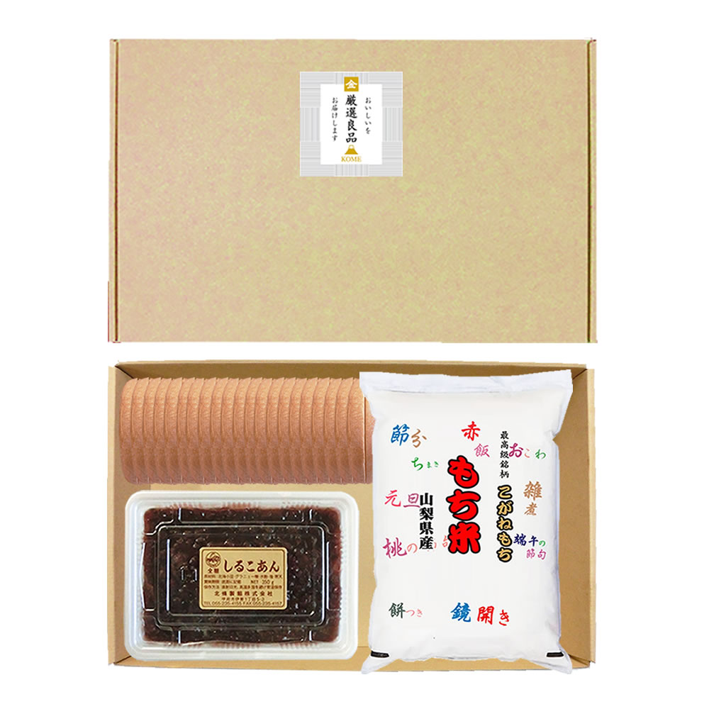 おしるこでもよし、最中にしてもよし、あんころもちにしてもよし。名称:菓子 品名:しるこあん 原材料:北海小豆 グラニュー糖 水飴 寒天 緑茶 塩 寒天 内容量:350g、350gx2個 賞味期限:商品記載(約3ヵ月) 名称:もなかの種(皮) 原材料:新潟県産こがねもち米 内容量:30枚(15セット) 賞味期限:12ヵ月) 保存方法:直射日光、高温多湿をさけて、常温で保存してください。名称:もち精米 産地:山梨県産 品種:こがねもち 産年:令和5年産 使用割合:単一原料米 ●内容量:2kg ●精米年月日:ラベルに記載 本商品は、受注生産のためお届けに2-3日かかります。返品、キャンセルは出来ません。