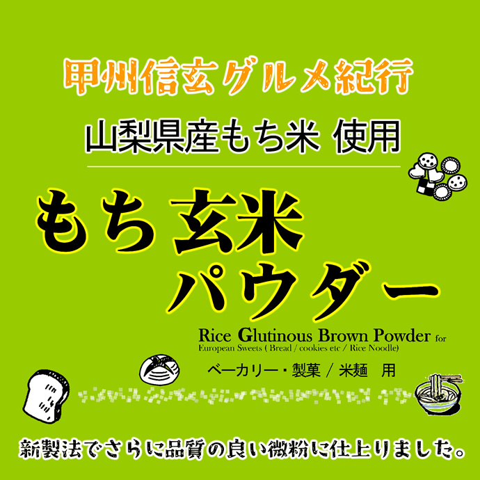 山梨県産の水稲もち米の玄米をパン・製菓用として平均粒度80ミクロンに製粉しました。■名称 玄米もち粉 パウダー ■原材料 もち玄米(山梨県産の水稲もち米)■賞味期限 製造日より1年 ■内容量 10kgx2